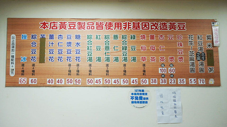壁にかかったメニュー、「杏仁豆花」は何となくわかります、左隣の「畳」みたいな字がわからないですが、挑戦します。