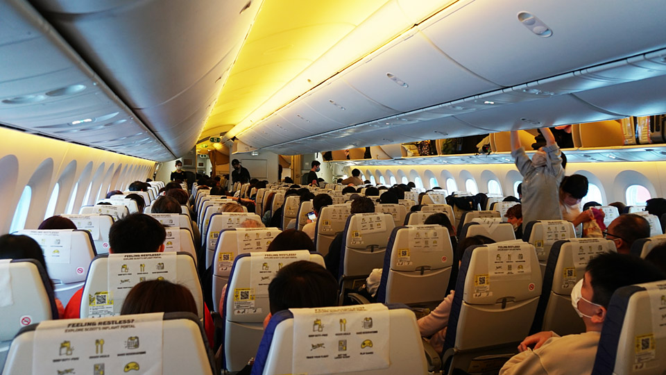 機内の様子、スクート 11:10 台北発 TR892便、使用機材は B-787、ほぼ満席状態ですね往路便も窓側3列の中央席と通路側席。