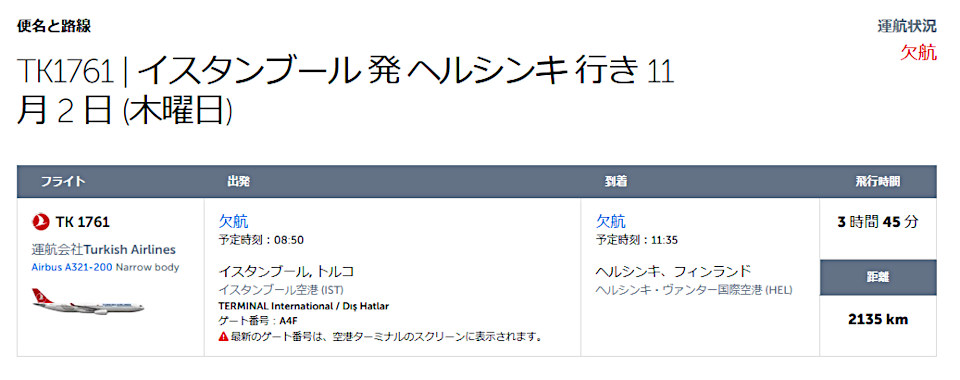さて、機内食を食べて眠って、心地よかったのはこの辺あたりまで、予定ではTK199便は06:45にイスタンブール空港着、2時間25分の乗り継ぎ時間で、08:50にTK1761便に乗り継ぎ、ヘルシンキ・ヴァンター国際空港着のスケジュールです、でした。