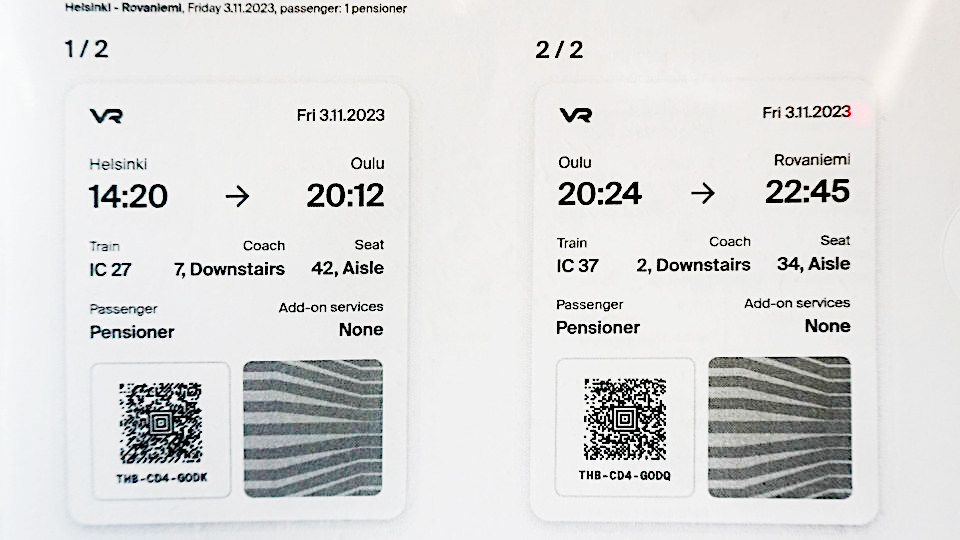 窓口でA4の用紙にプリントアウトされたチケット、乗車当日の購入でじわじわと高くなってゆく料金でしたが、二名分171.2ユーロ、とにかく購入できればラッキー「オウル」という駅での乗り換えになります。