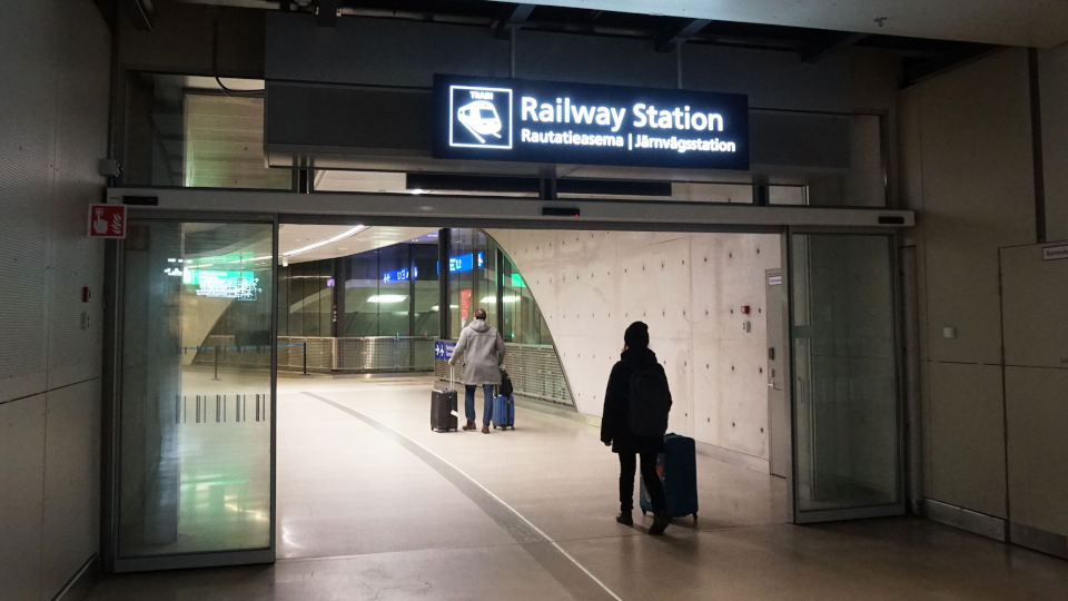 ヘルシンキ中央駅に向かうために列車乗り場へ向かいます、案内板では右側の先の方、バス乗り場も同じ方向のようです。