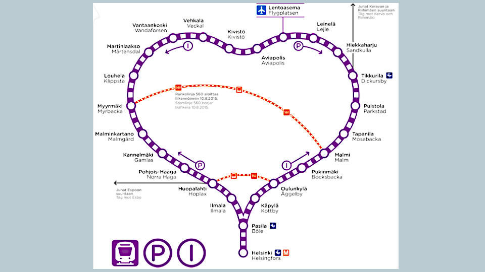 ヘルシンキ中央駅までは「P」「I」線があってホームのどちら側から乗っても着くようですが、ヴァンター空港からは「P」線の方が駅の数が少ないので所要時間は短いようです、山手線の内回り、外回りの感じですか。