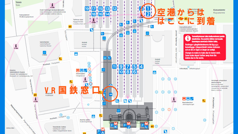 マップを見ると、空港からの列車は1,2番ホームに到着、かなり長いホームを歩いて、駅舎の中にはいり、ぐるりと反対側に回ったところに「VR」の窓口があります。