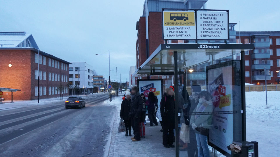 ロヴァニエミの街歩きのために、8番のバスで中心部へ向かいます、土曜、日曜のバス便は平日に比べて極端に少なく往復6便、11時30分のバスに乗ろと思い少し早めにバス停で待ちますが、このバス停に表示されて時間は出発点からの時間らしく、時間になってもなかなかバスは現れません、そのうち地元の人と思われる女性が来たので、バスが来ることは間違いなしと確信しました。