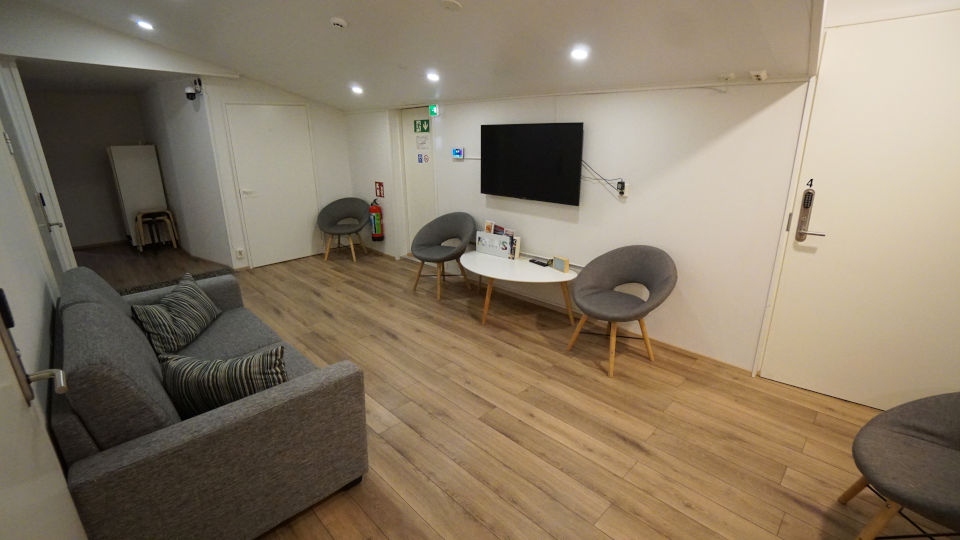 ワシらの部屋から見た、広めの共用スペース、ちなみにフィンランドでは靴を脱いで中へ入ります、ワシはこんな時はもっぱらビーサンを愛用しています。