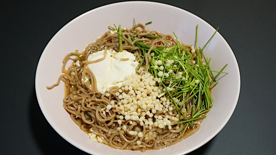 かなり遅めの昼食、持ち込みのインスタント袋麺の蕎麦に、揚げ玉、ネギ代わりのチャイブ、卵はスーパーで、この日も自炊です。