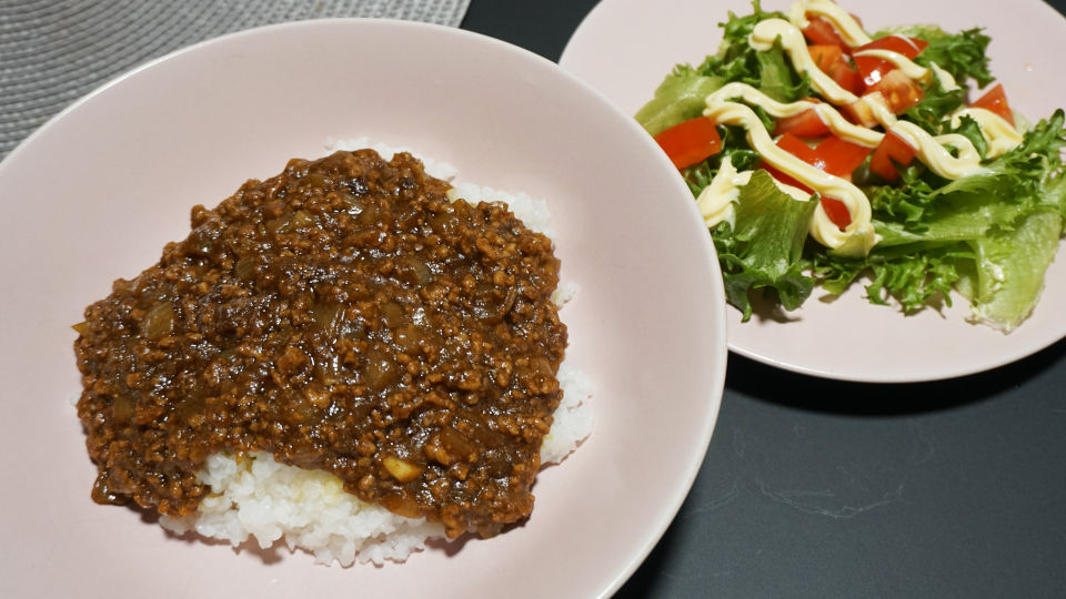 夕食は、アルファル化米にスーパーで購入のひき肉、玉ねぎを入れたキーマカレー、とサラダ、カレールーは持ち込みです。
