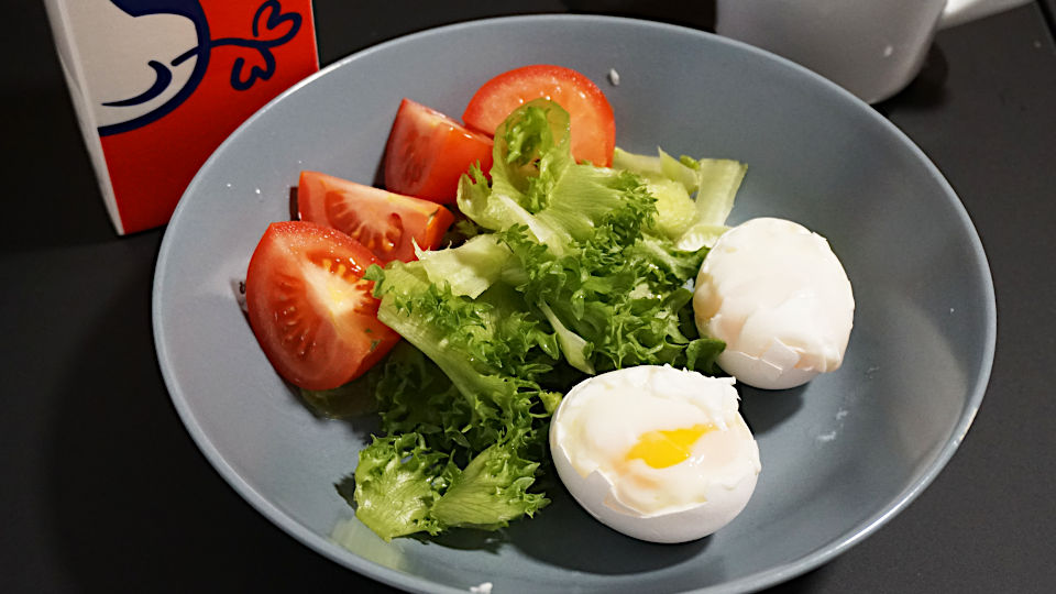 今日もお遅い朝食、サラダの後ろのパッケージは牛乳 1.69 ユーロ、