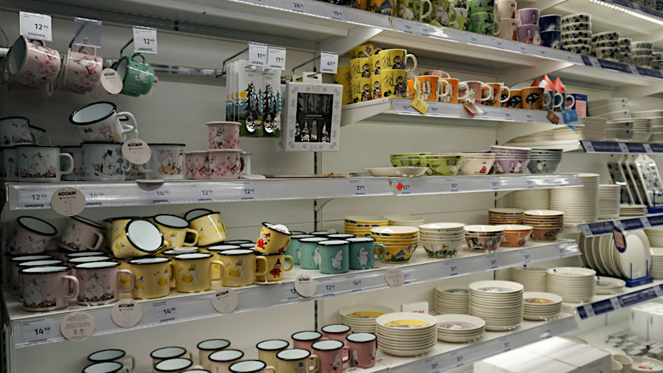 ムーミンがデザインされた食器類の陳列棚、ホーロー製と思われる小ぶりのモノでも 14.99 ユーロ、2400円ほどしていました。