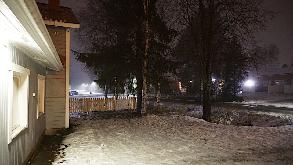 テナントとしてなじみのある「SUBWAY」やピザ屋さん、地元のハンバーガーショップ「Hesburger」も入ってるようです、駐車場の路面にはほとんど雪がありません、気温は少し高めでしょうか、この時は建物裏の空にも明るさが見えて、今日こそは晴れた夜空が眺められるかと期待しました、「青い空」久々です。