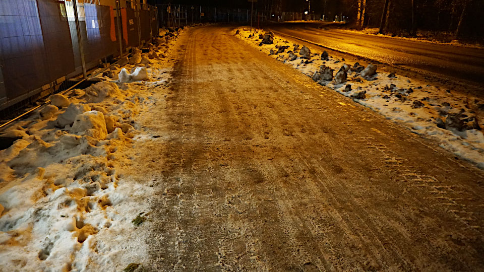 暗がり求めて、何度か往復した幅の広い歩道、トラクターショベルのバケットから、おがくず状の融雪剤と思われるものを散布してあるので、凍結はしていません、周りの白い雪の部分もザクザクの状態です。