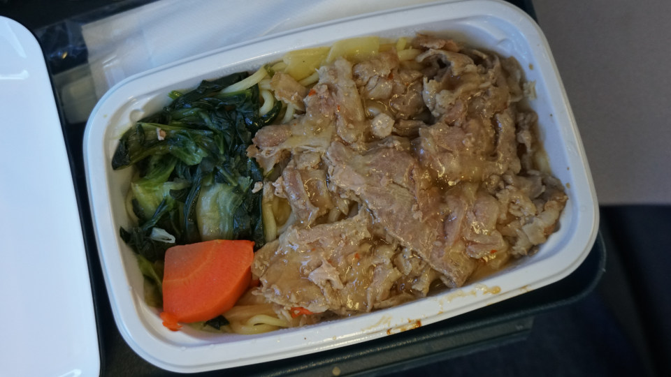 そして、貴重なお楽しみになった機内食のサービス、選択肢は「チキン」か「ヌードル」です。