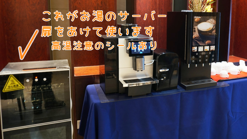 熱いお湯が提供されないかと観察したら、コーヒーサーバーの左側、四角い物体が熱いお湯のサーバーでした、扉を開けると蛇口があります。
