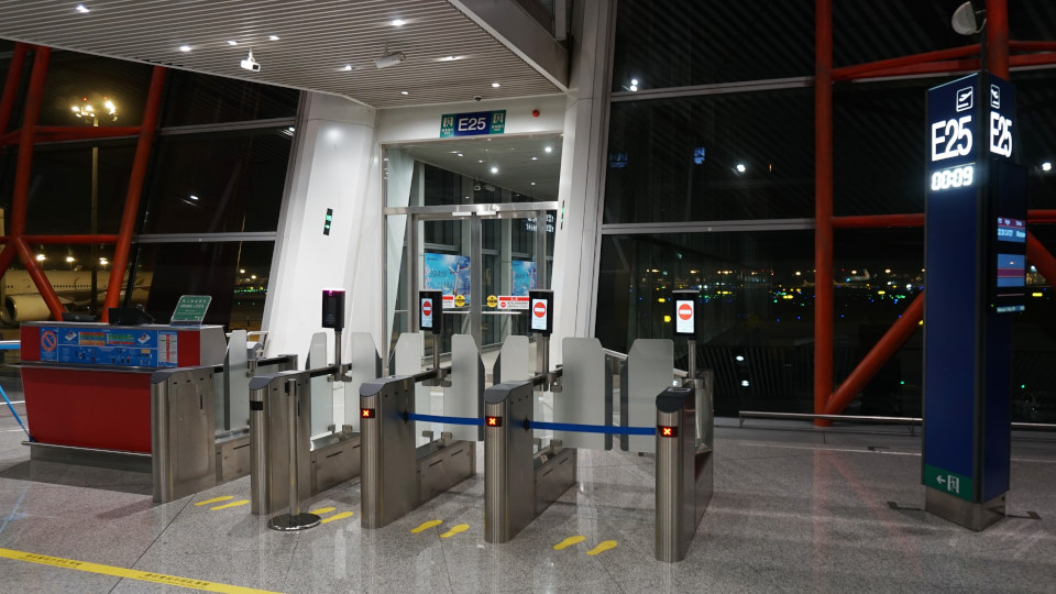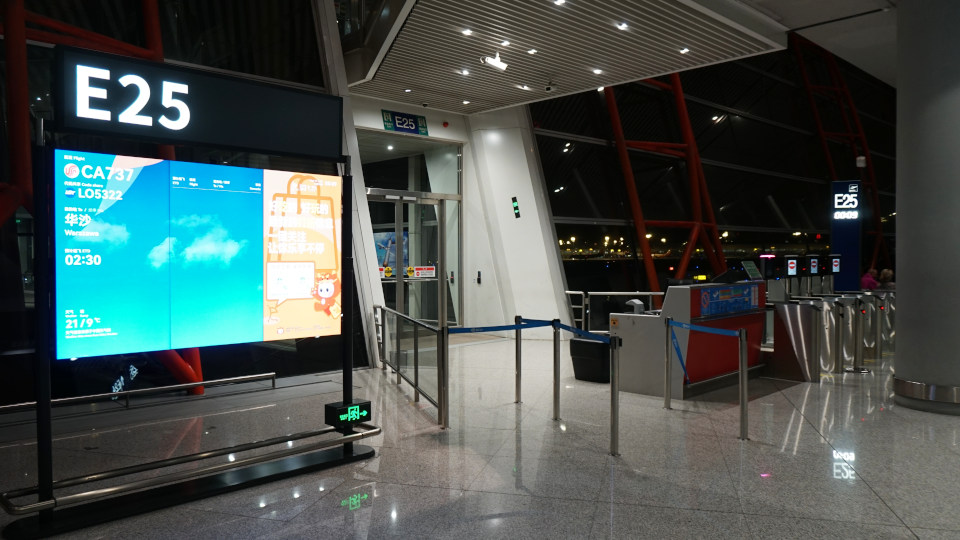 0時を過ぎたくらいの搭乗ゲートE25、すでに出発便の情報は表示されています。