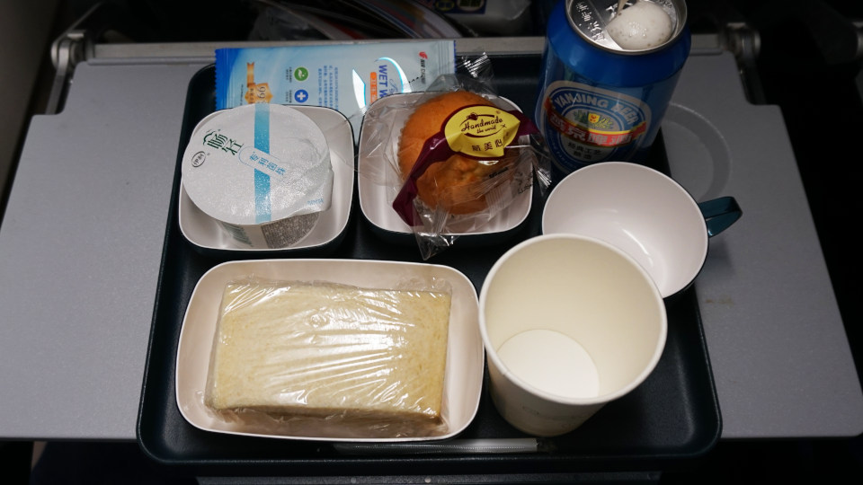 で、やっぱりお楽しみは機内食のサービスのみ、3時を過ぎて一回目の機内食、この時は選択肢なしの配給状態、先に飲み物サービスはあるのでここはビールをお願いして、ラップに包まれたサンドイッチがメイン、付け合わせはヨーグルトとカップケーキ。
