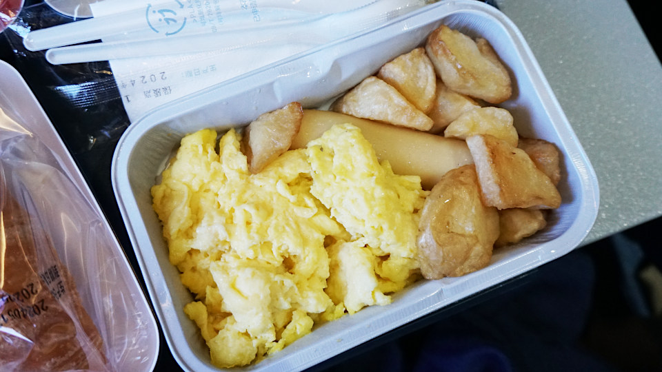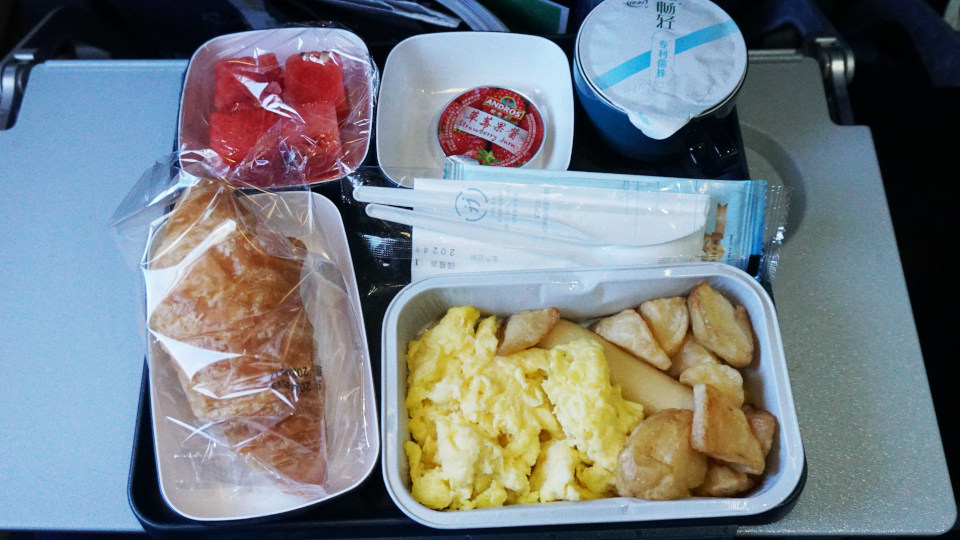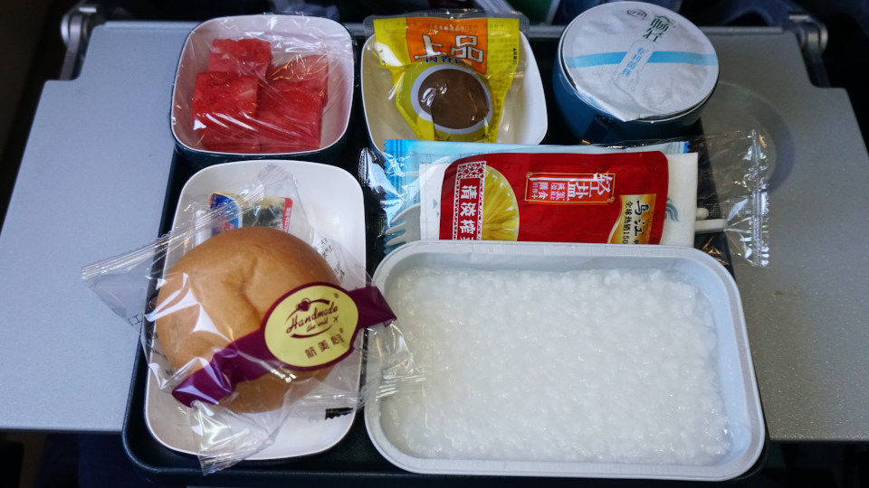 こちらは、まさしく「朝食セット」左手にクロワッサン、おかゆの付け合わせパンよりは気持ち美味しめ、メインのスクランブルエッグ、フライドポテトの盛り合わせ、付け合わせはカットスイカ、イチゴジャム、ヨーグルト。