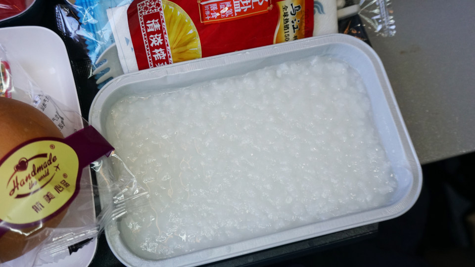 おかゆはわりとサラサラした感じ、上に並んでるパッケージはザーサイです、塩味の足りない分はこれを混ぜていただきます。