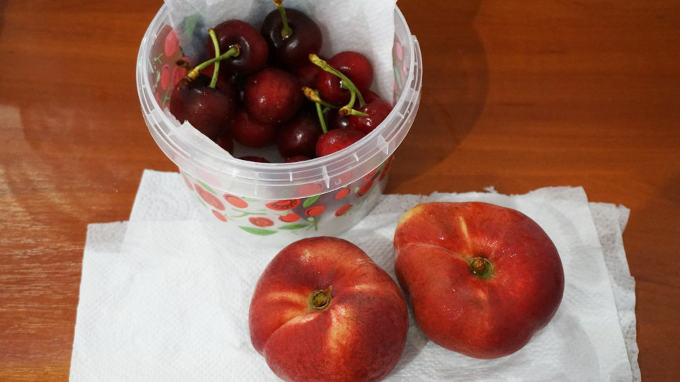 昨日スーパーで購入のさくらんぼや、残しておいた、ちょいといびつな桃で朝食代わりです。