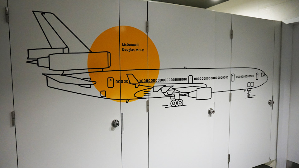 トイレの個室ドアのデザイン、なかなか素敵です、しかも機体がMD-11、乗ったことあります。