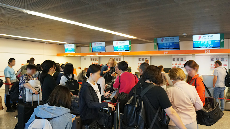 さて、13:30発エアチャイナ CA738便のチェックインが始まりました、今回は往路、復路ともに事前座席指定をしているので、早く並ぶこともないのですが、受託荷物を早く預けてしまいたいので、早々に列に並びます。