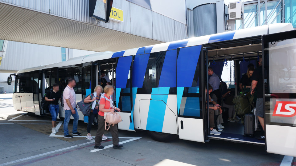 CA738便は沖止めのようで、航空機までは連絡バスでの移動です、かなり長い連接バスです。