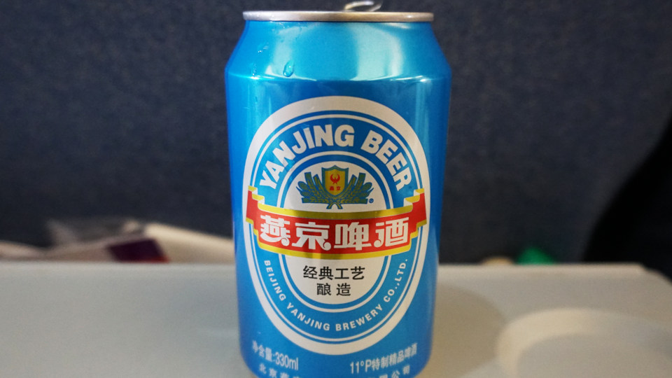 となれば、お楽しみは機内食のみと言うことで、飲み物はビールをいただきます、中国製です。