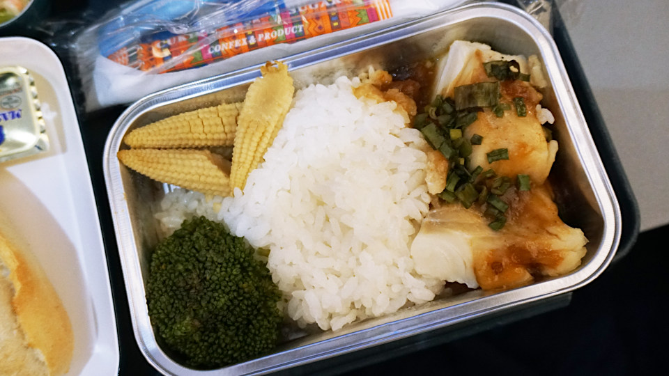 機内食には「チキン」か「フィッシュ」の選択肢があったのですが、ワシらの所にサービスが始まった時点には「フィッシュ」のみの配給状態に、白身魚にあんかけソースのような一品。