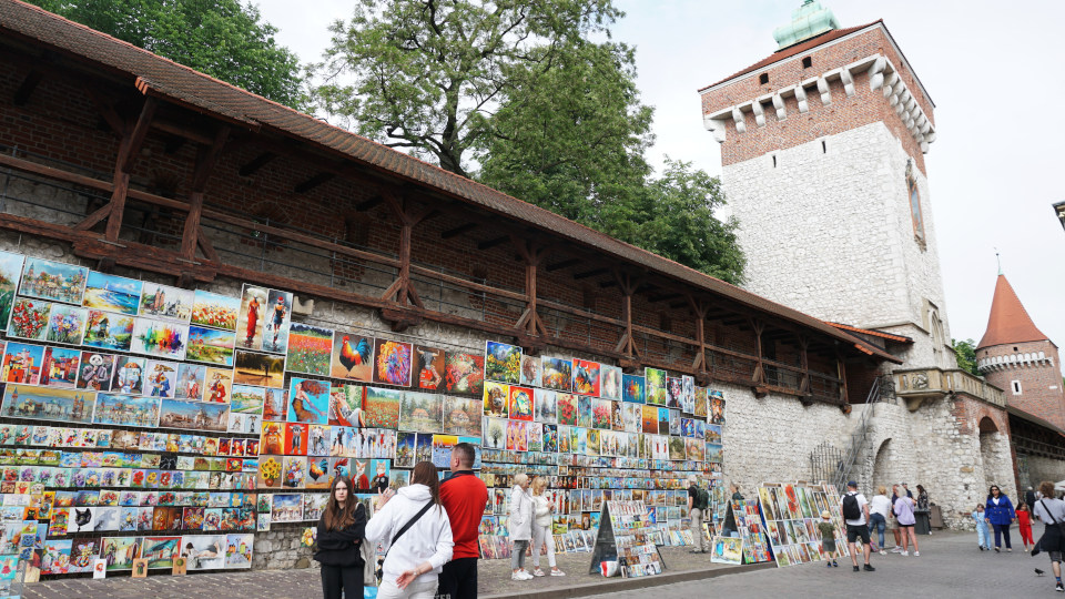 1300年頃に建てられた城壁の一部「フロリアンスカ門」旧市街の北門に当たります、この門をくぐって旧市街エリアへ、壁にはお土産用の絵画がずらーと並びます。