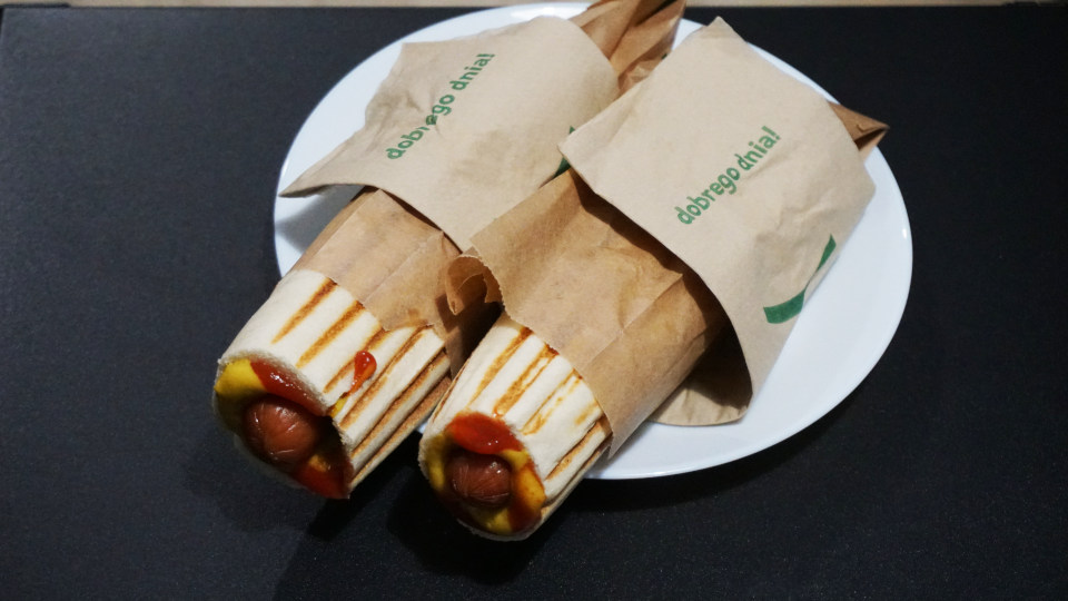 ホステル近くのコンビニ「Zabka」へ買い物に、ポーランド風ホットドック、名前も「Hot Dog」ですが、パンの穴にソーセージを詰め込む形式です、2本で少し割引、13zt、日本のクレジットカード使えません。