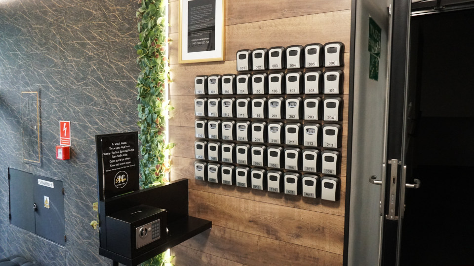 入り口もキーコードで開けて、さらに部屋のキーボックスが並びます、チェックアウト時は左側の金庫風なキーボックスへ返却するようです。