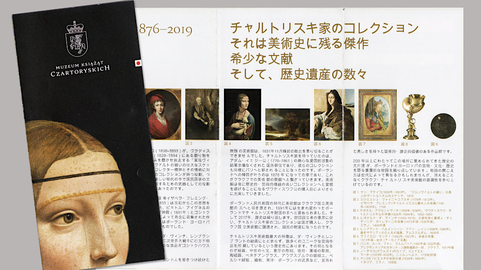 「チャルトルスキ美術館」のA4サイズ三つ折りパンフレット、日本語もありました、表紙はもちろん「白貂を抱く貴婦人」です、ちゃんとしたパンフレットをもらうのはポーランドに来てからは初めて。