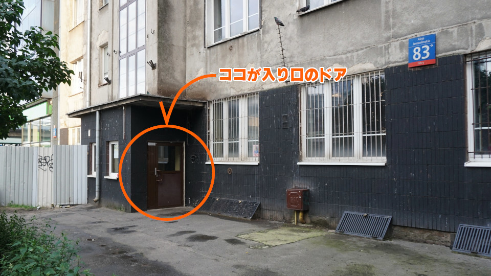 で、連れていかれたのがここです、少し奥まっていましたが、電話していた隣のビル、本当に「ワルシャワ中央駅」の斜め前なんですが、もちろん当日このあたりは薄暗く、この写真は次の日に撮ったもの、ホステルの看板もありません、かなり怪しところでした、ご近所さんも分からないはずです。