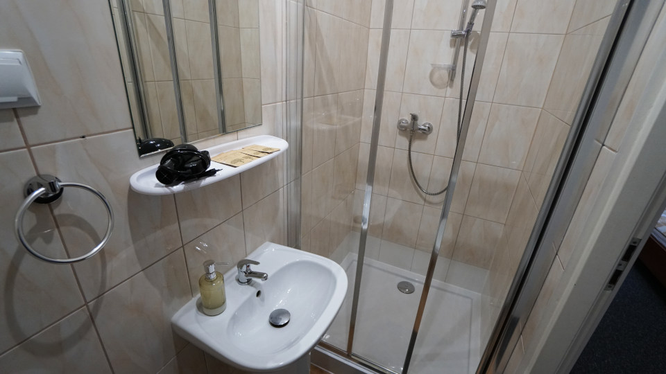 バスルームの水回り、トイレと洗面ボウル、右側にシャワー。