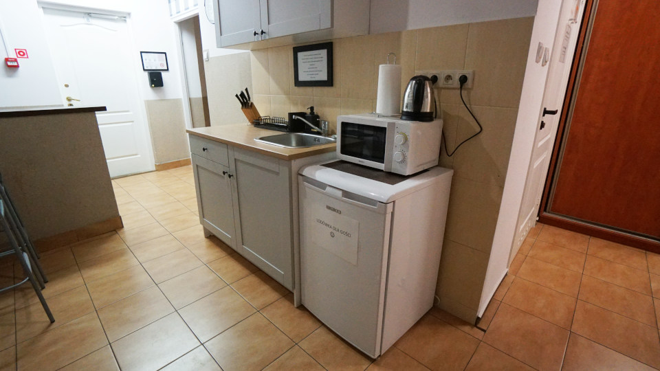 小さなシンクと右側に電子レンジ、電気ポット、上の戸棚に食器を類が収納されています、中央の注意書きに、食器は洗って拭いて元の場所に、利用は午後11時までとありました。