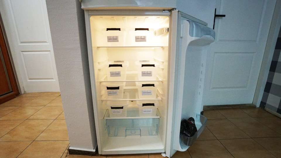 冷蔵庫の中にはルームナンバーを書いたプラスティックのコンテナが並んでいますが、使ってる様子はなし。