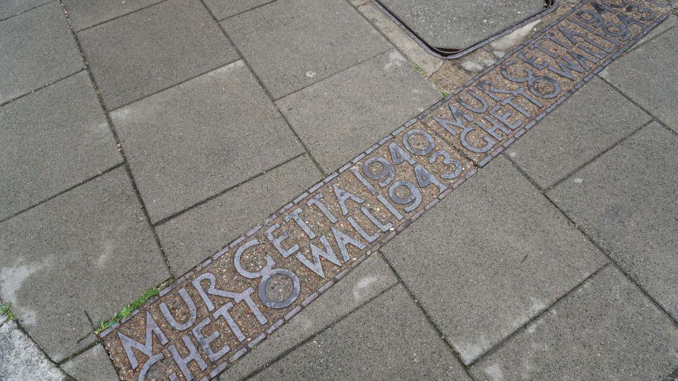 下車したバス停から「キュリー夫人博物館」へ行く途中にあった、「ワルシャワ ゲットーの境界標識」の碑と、