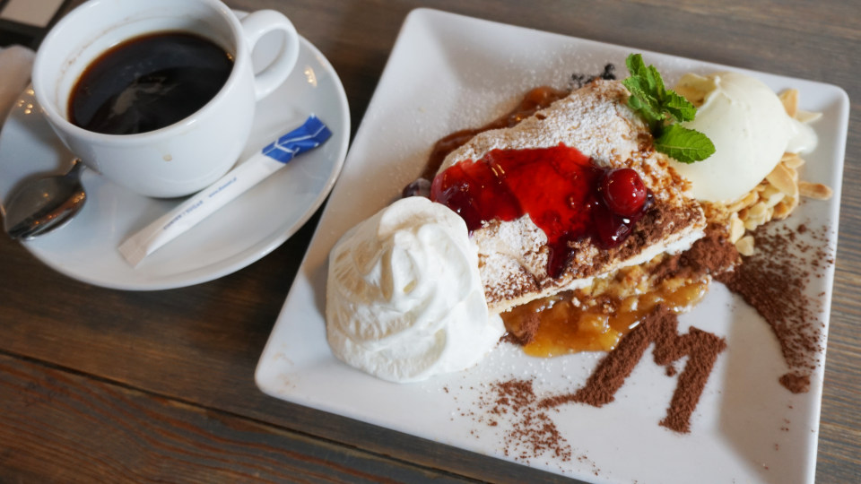 そして、アップルパイ、アイスクリーム、ホイップクリーム添え、右側にココアパウダーの「M」の文字は「マネキン」ですね。