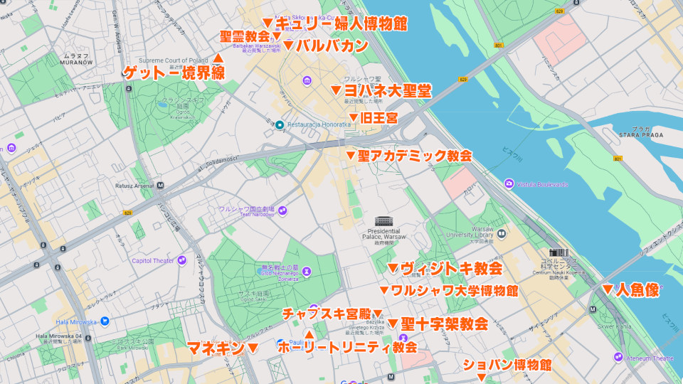 歩いてきたところをマップに落とすとこんな感じに、ボチボチ歩きですけどしっかり縦断コースです、よく歩きました、ここから次はバスで「ショパン博物館」を目指します。