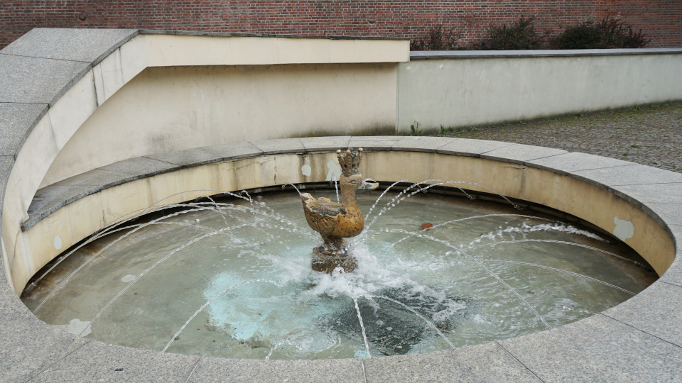 「ショパン博物館」の坂道裏側にあった公園、アヒル?白鳥?小さな噴水です、しかし頭には立派な冠をかぶっています。
