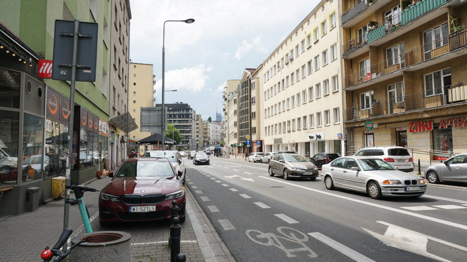 観光客は通りそうもない普通の道です、よく見ると車道に自転車レーンがありますが、ワルシャワの市内ではあまり自転車が走ってる姿を見かけません、東方向へボチボチ歩いて橋を目指します、来た道を振り返って見ています。