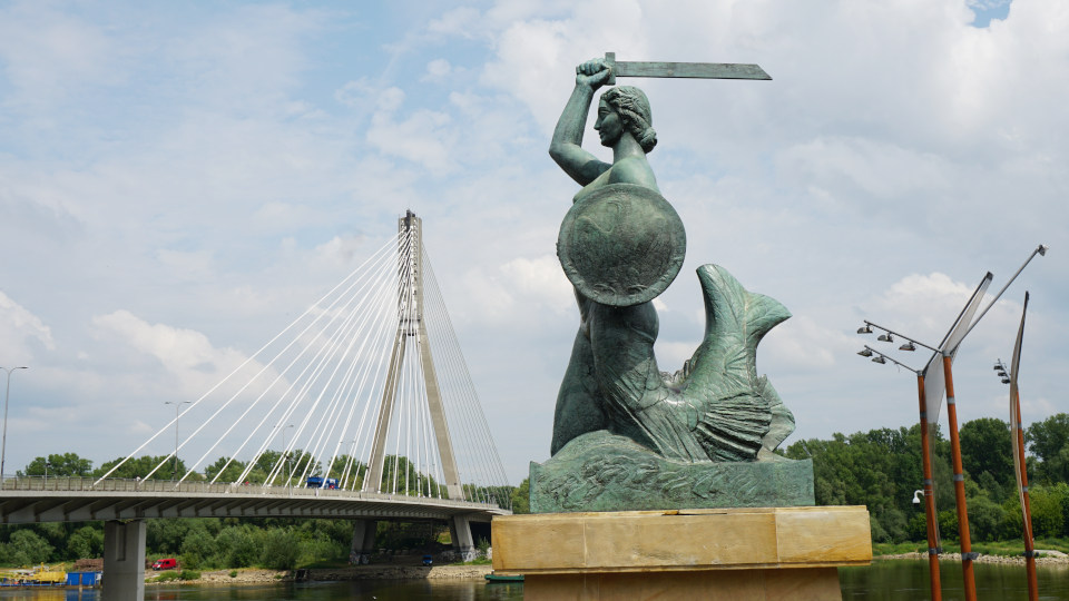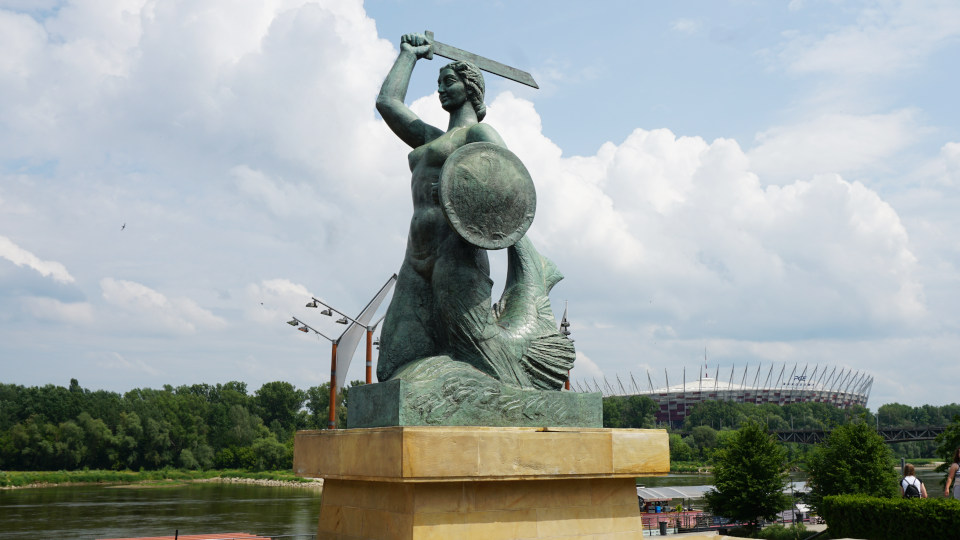 「シフィエントクシスキ橋」たもとの「人魚像」は戦う姿の勇ましい像です、後ろに見えるのは「ワルシャワ国立競技場」。