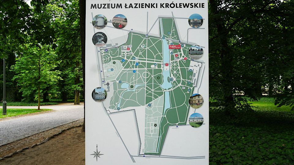 「ワジェンキ公園」内の案内板、ここもかなりの広さ、現在位置からほぼ園内を横断して、左端の「ショパン像」へ歩きます。