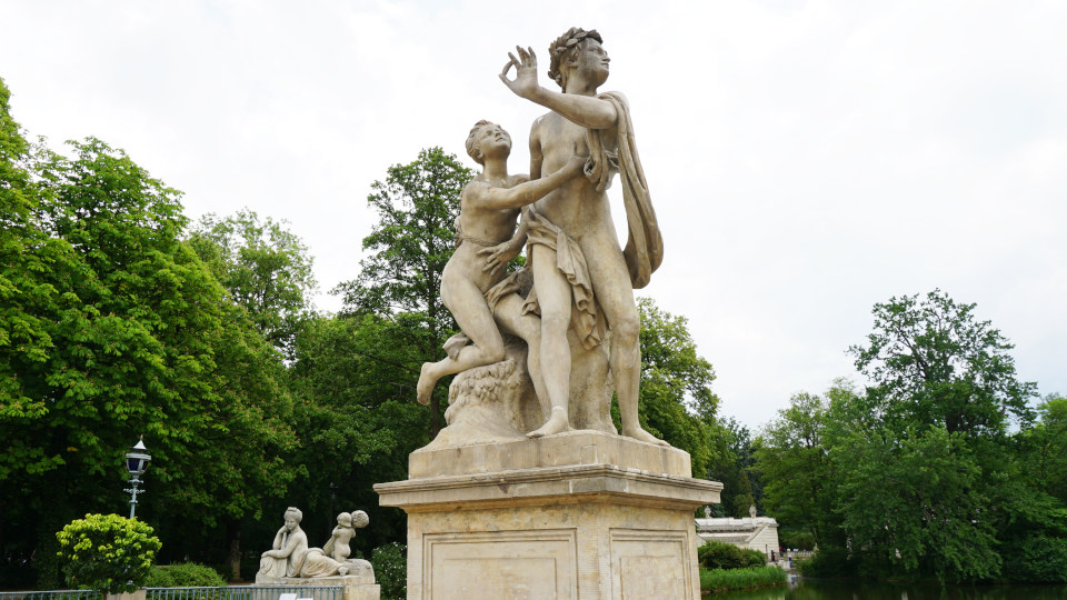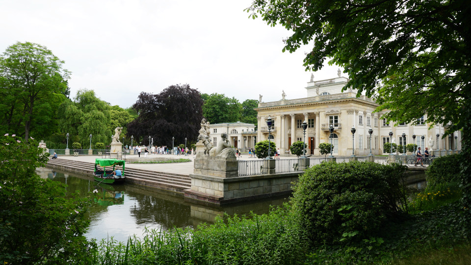 途中、お堀?の中にある「ワジェンキ宮殿」、手前のほとりに少し寂しげな観光ボートが客待ちしています。