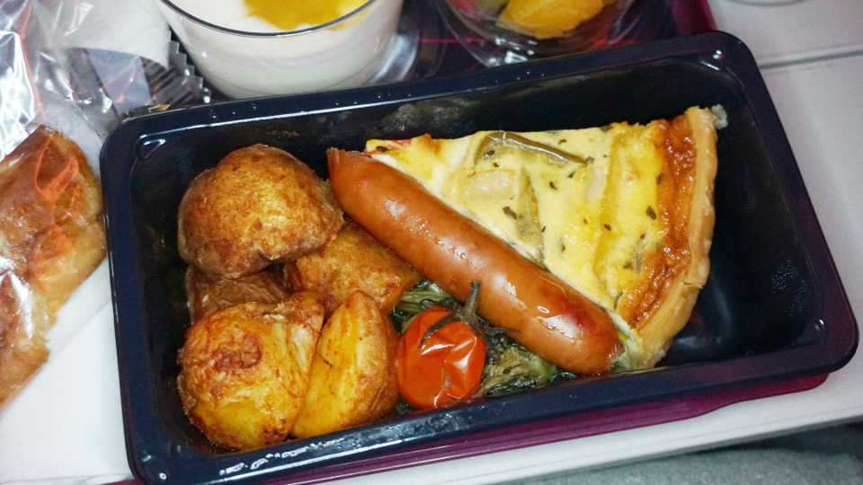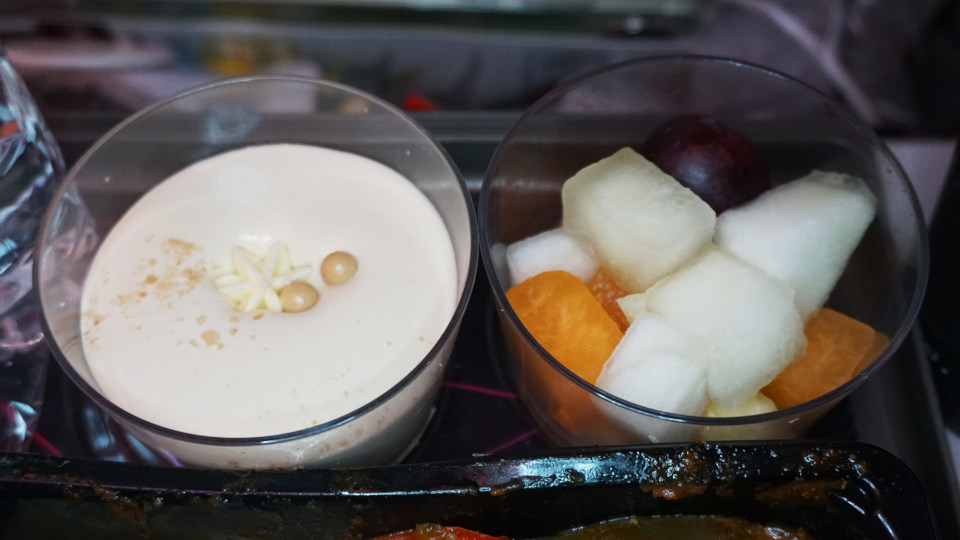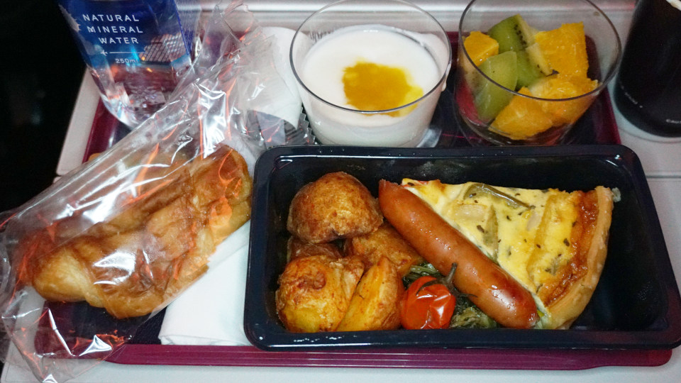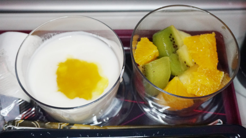 この時もCAさんの選択肢説明は同じ、詳しいメニューの説明で、聞き取れた「チキンソーセージ」を選択します、付け合わせは左からクロワッサン、ヨーグルト、カットフルーツ。