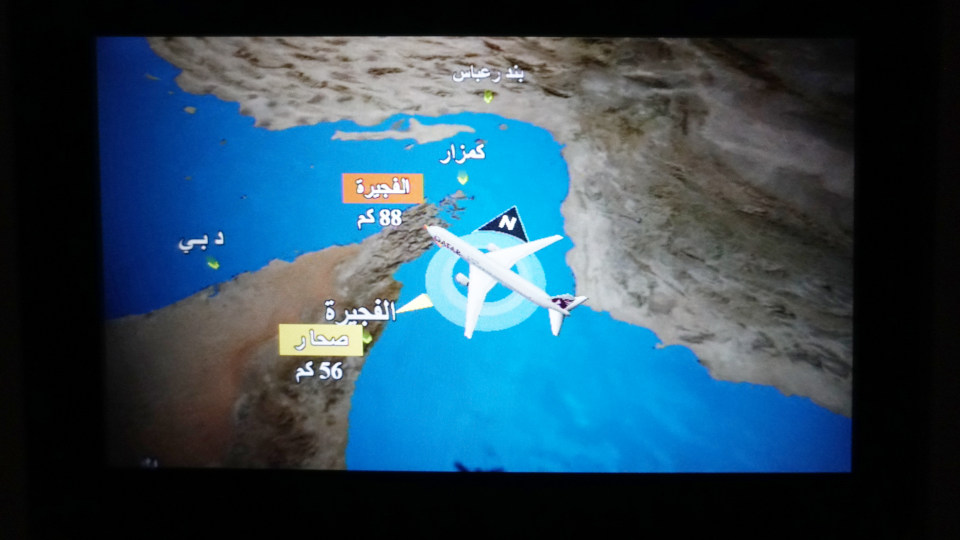 ボーイングのフライトマップ、見慣れたエアバスの仕様とはアラビア文字表示と言うこともあって、ちょいと感じが違います。