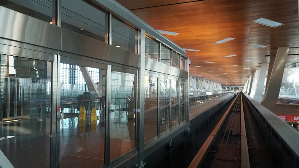 搭乗ゲートへは先ほどターミナル中央へ移動した通路の上部に設置された、連絡用シャトルを利用します。