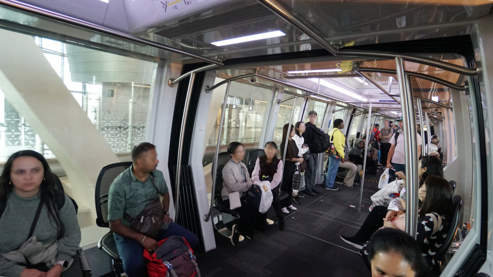 車両の内部はこんな感じ、大きな連続した窓、椅子席は少ないですがわりと広めです、駅はターミナル中央とコンコースCの二か所だけ。