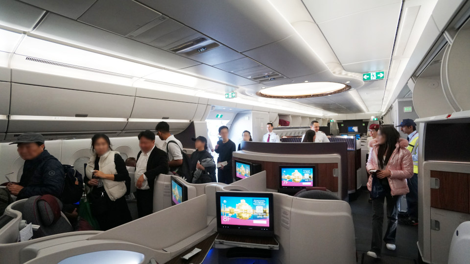 ボーディングブリッジだと通らない、余裕の4列シートのファーストクラスエリアを通過、モニターも大きいです。