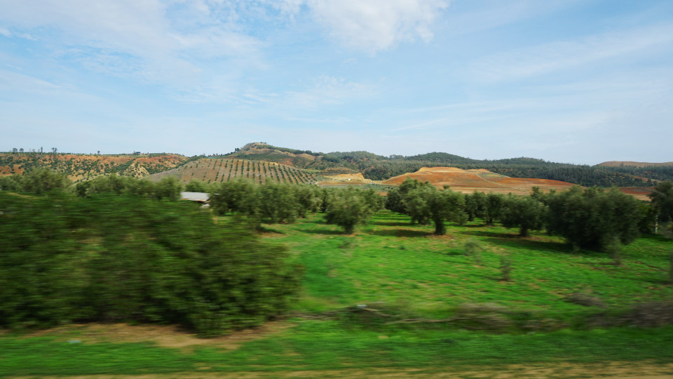 バスの車窓から、この辺はオリーブ畑が広がって緑多めです。