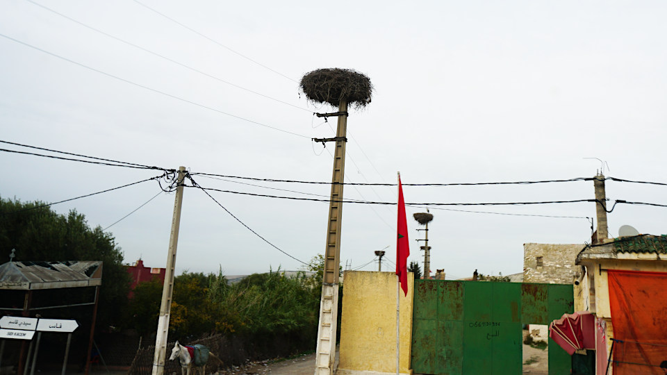 街中の電柱の上にあるのは「コウノトリ」の巣、モロッコの背の高い電柱は梯子のようなデザインが多いです。